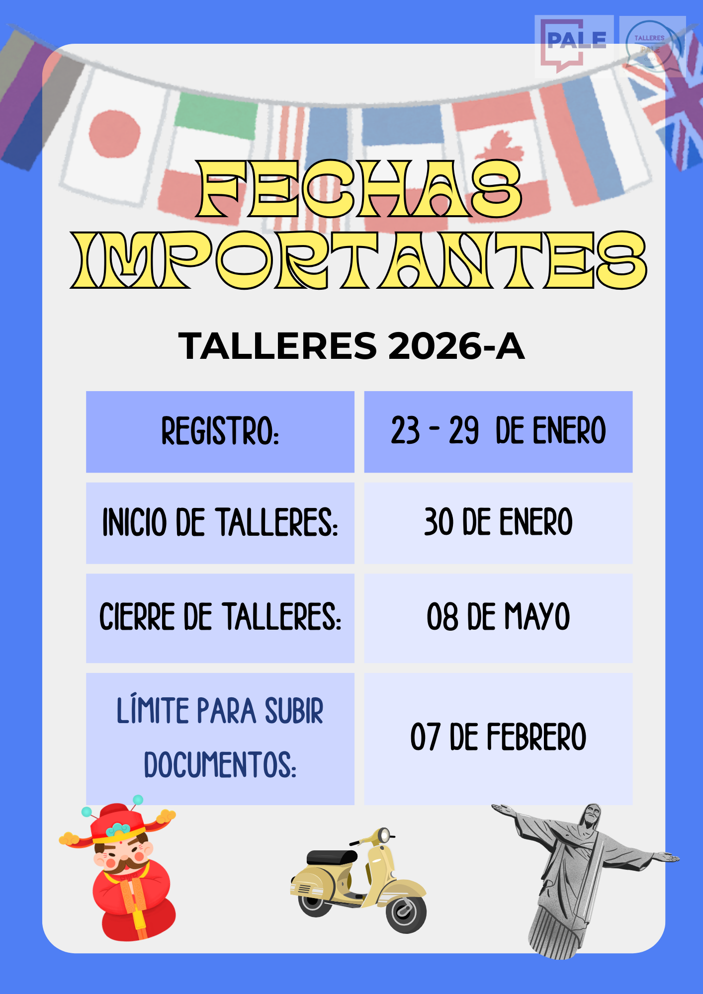 El Programa de Aprendizaje de Lenguas Extranjeras (PALE) del CUCEA, ofrece una amplia oferta de talleres de idiomas abiertos al público en general. Estos talleres no dan créditos ni tienen validez oficial. Podrás agendar un máximo de 3 talleres por semestre.